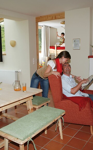Romantik-Zirben-Ferienwohnung zu 70-80 Quadratmeter mit 2 Schlafzimmern (1 Zimmer mit Doppelbett und 1 Zimmer mit Stockbett), moderner Küche mit gemütlicher Essecke, bequemer Fernsehsessel, Sat-TV, Kachelofen zum selbst beheizen und Wintergarten.